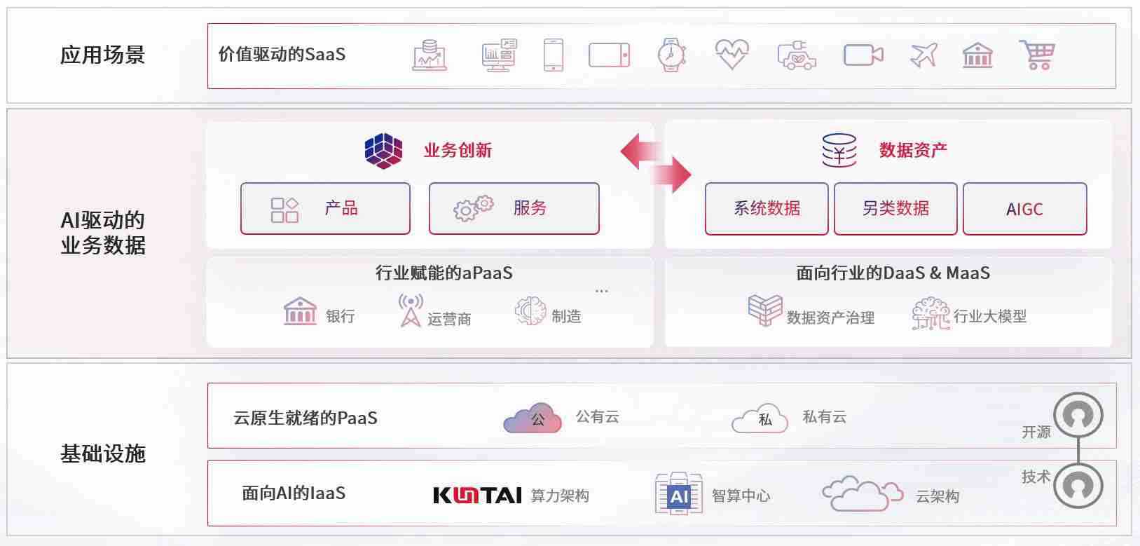 数字时代,,围绕企业数字化转型的关键要素,,亚洲必赢数码开创性的提出数云融合战略和技术体系框架,,,着力在云原生、、、数字原生、、、AI原生和信创产业上架构产品和服务能力,,,为处在不同数字化转型阶段的快消零售、、汽车、、、、金融、、医疗、、、、政企、、、教育、、运营商等行业客户提供泛在的敏捷IT能力和融合的数据驱动能力,,,构建跨界融合创新的数字业务场景和新业务模式,,,,助力企业级客户建立面向未来的核心能力和竞争优势,,,全面推动社会的数字化、、智能化转型升级。。