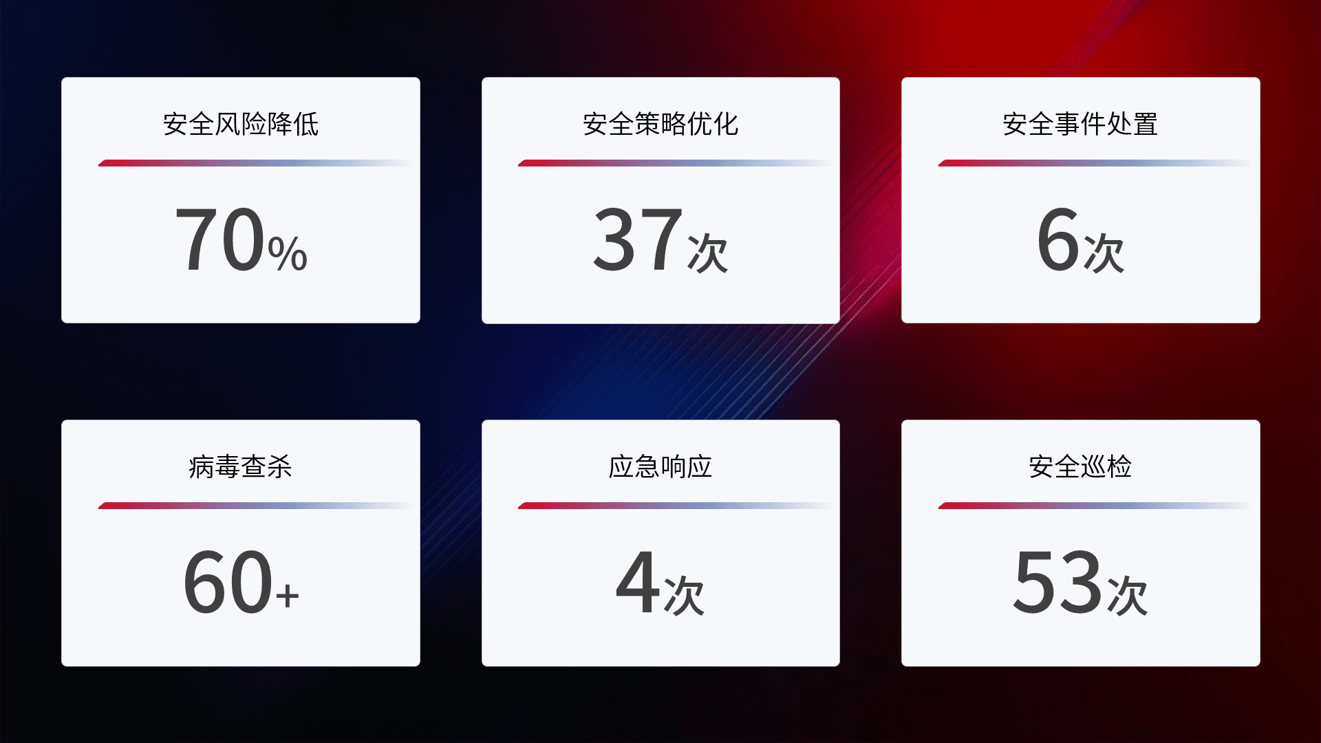 提供全面的安全事件报告体系,,包括处置报告、、、周报、、、季度和年度总结,,,结合持续监控,,,帮助客户深入了解网络安全状况。。